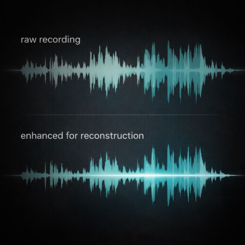 We do not simply run old clips through AI. Your source audio is cleaned and leveled so the voice comes forward with more clarity and consistency. This includes removing low rumble, boosting presence for intelligibility, compressing dynamics, adjusting gain, converting to mono, fixing export bitrate, and protecting against clipping.