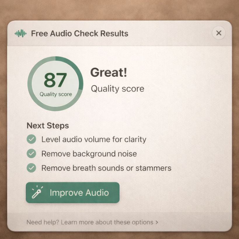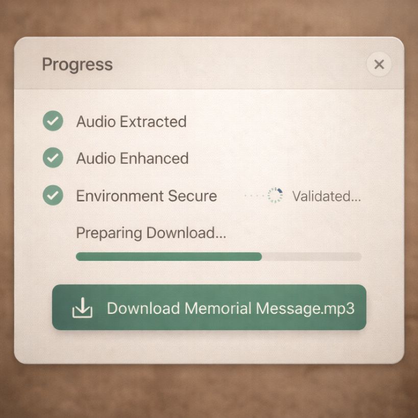 Upload what you have and receive a clear quality report by email. If your recording lives inside an old video, use the free Memory Extractor first, then check the audio and continue only when you feel ready.